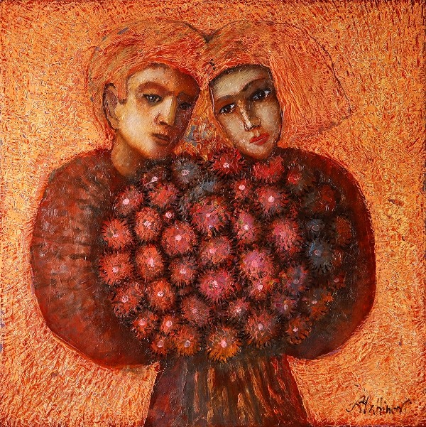 Абжинов считается новым поколением художественных мастеров. Работы, написанные в модернистском стиле, он выставляет не только на персональных, но и на групповых выставках.